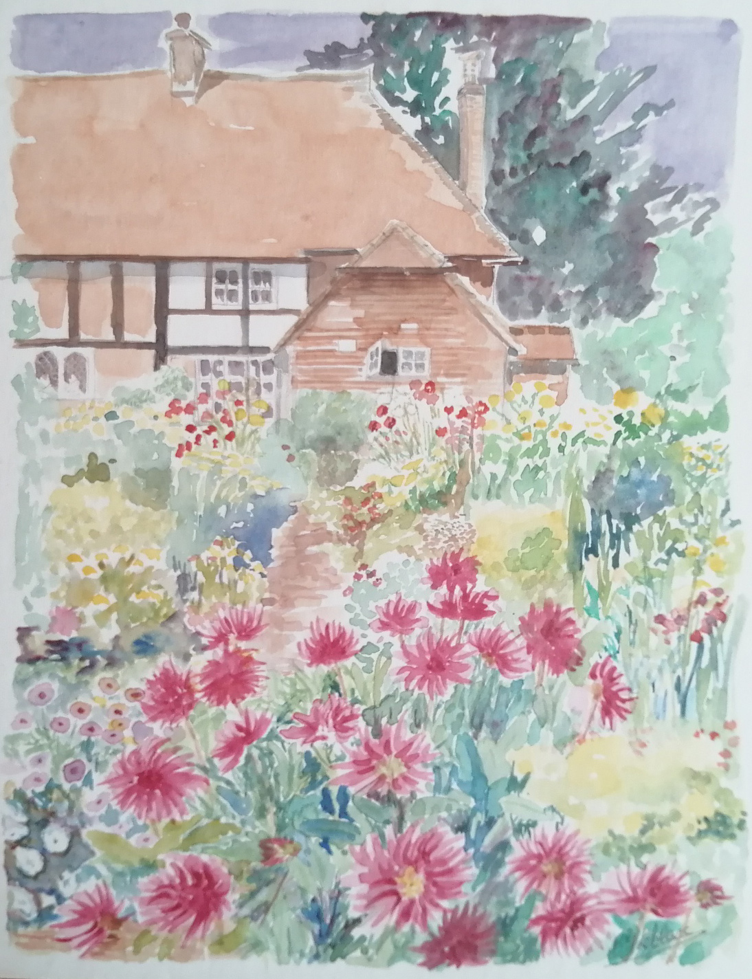 Unframed – mock Tudor cottage and garden – watercolour