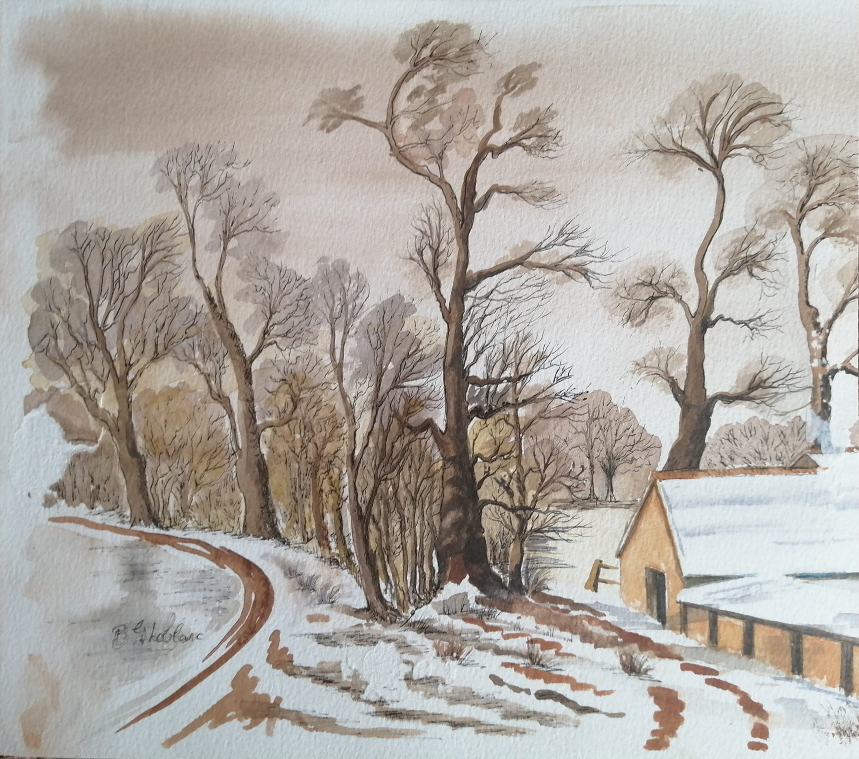 Unframed print – rear of St Mary’s church in snow – watercolour